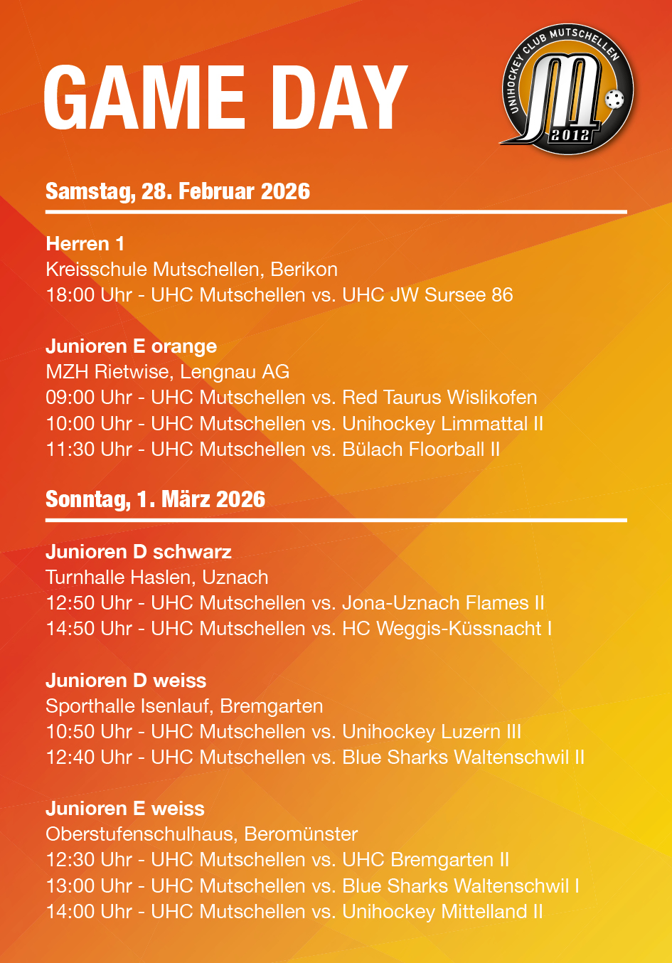 Samstag, 28. Februar 2026, 18:00 Uhr Kreisschule Mutschellen, Berikon UHC Mutschellen 1 vs. UHC JW Sursee 86